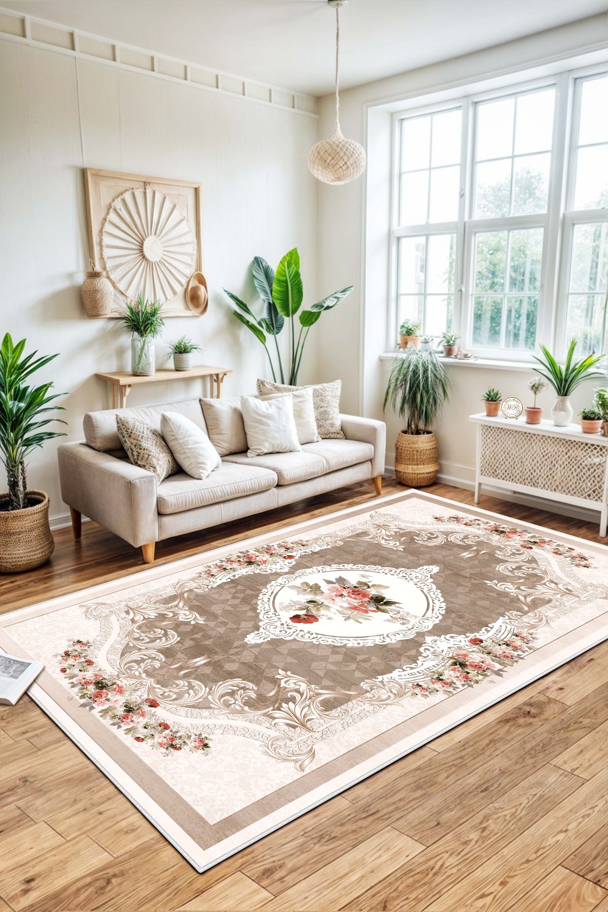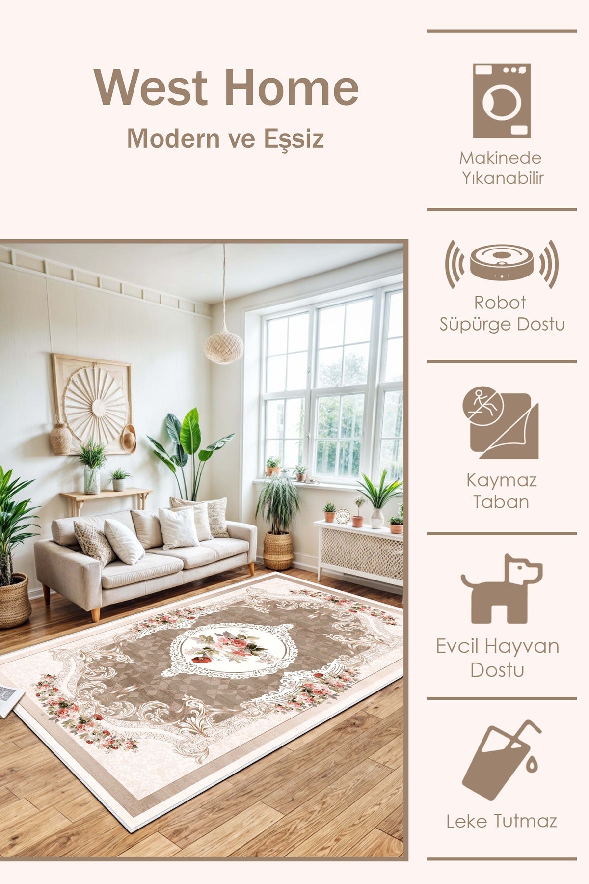 West Home Dijital Baskılı Yıkanabilir Kaymaz Taban Salon, Mutfak ve Yolluk Halısı-455 Beige