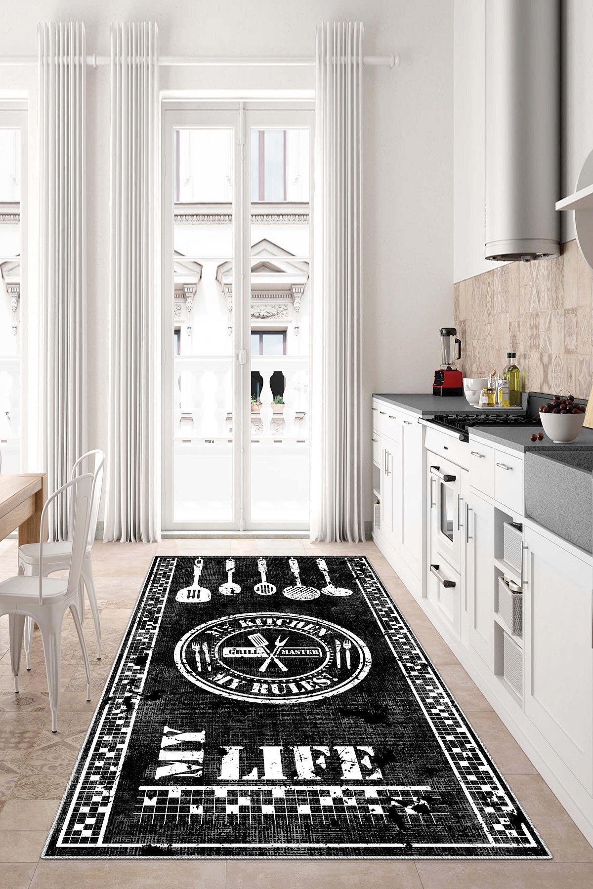 West Home Dijital Baskılı Yıkanabilir Kaymaz Taban Mutfak Halısı-442 Black